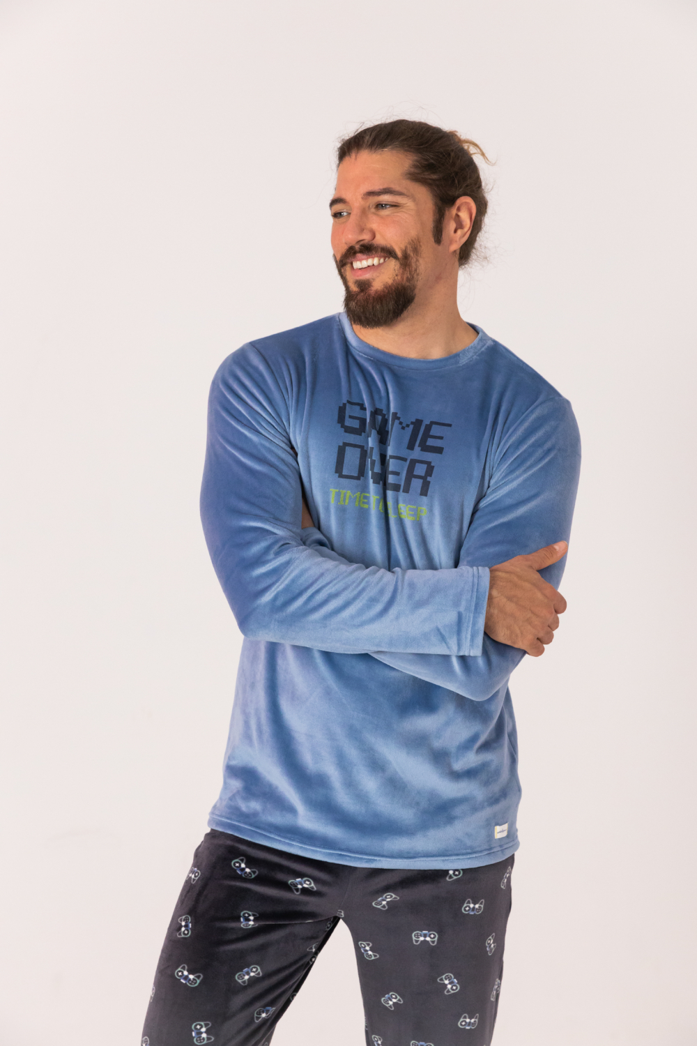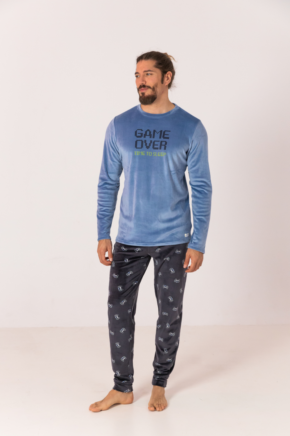 PANTALÓN LARGO ESTAMPADO DE CONSOLAS CON FONDO AZUL MARINO, BOLSILLOS LATERALES Y CINTURILLA ELÁSTICA. ACABADO CON PUÑO EN EL BAJO.