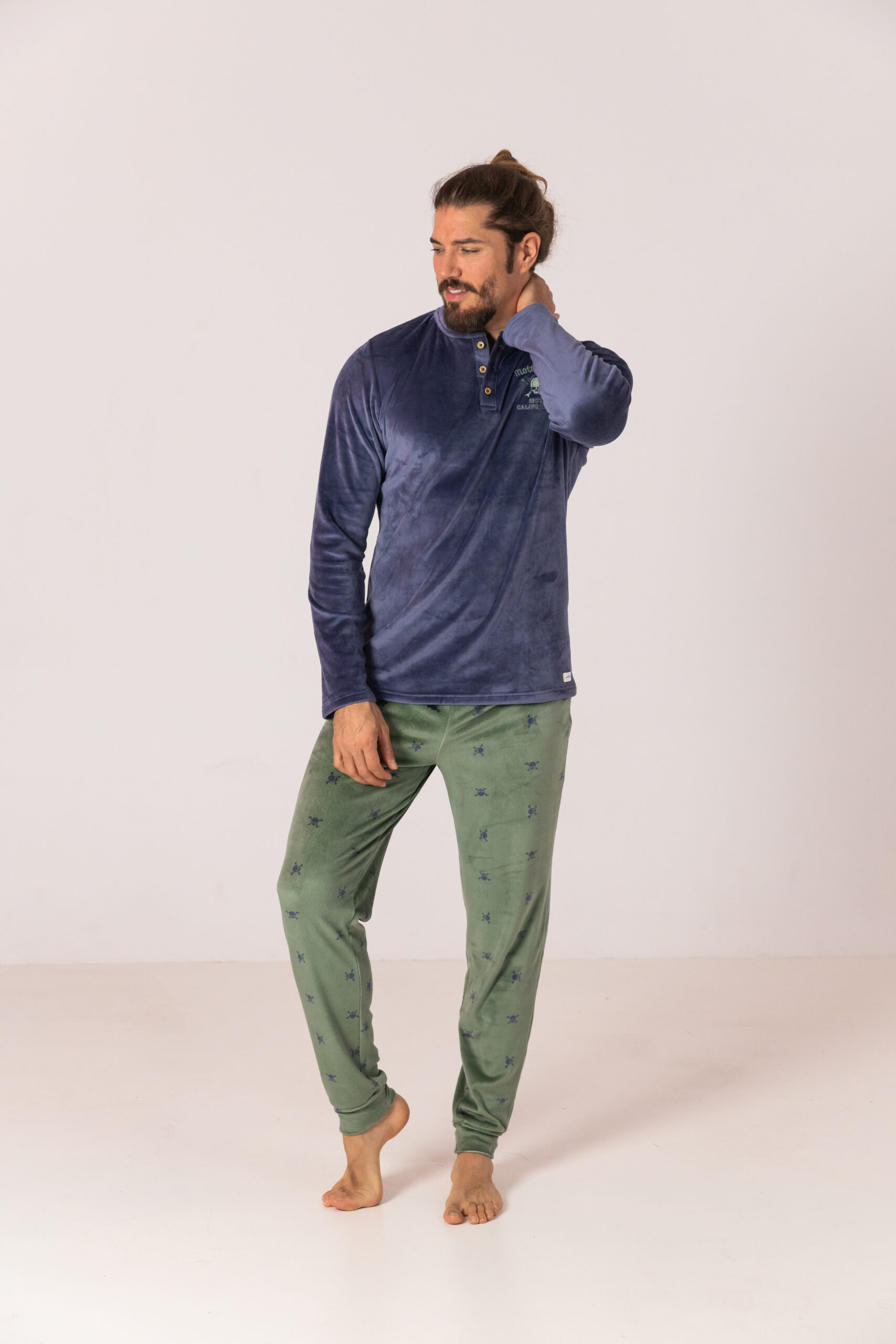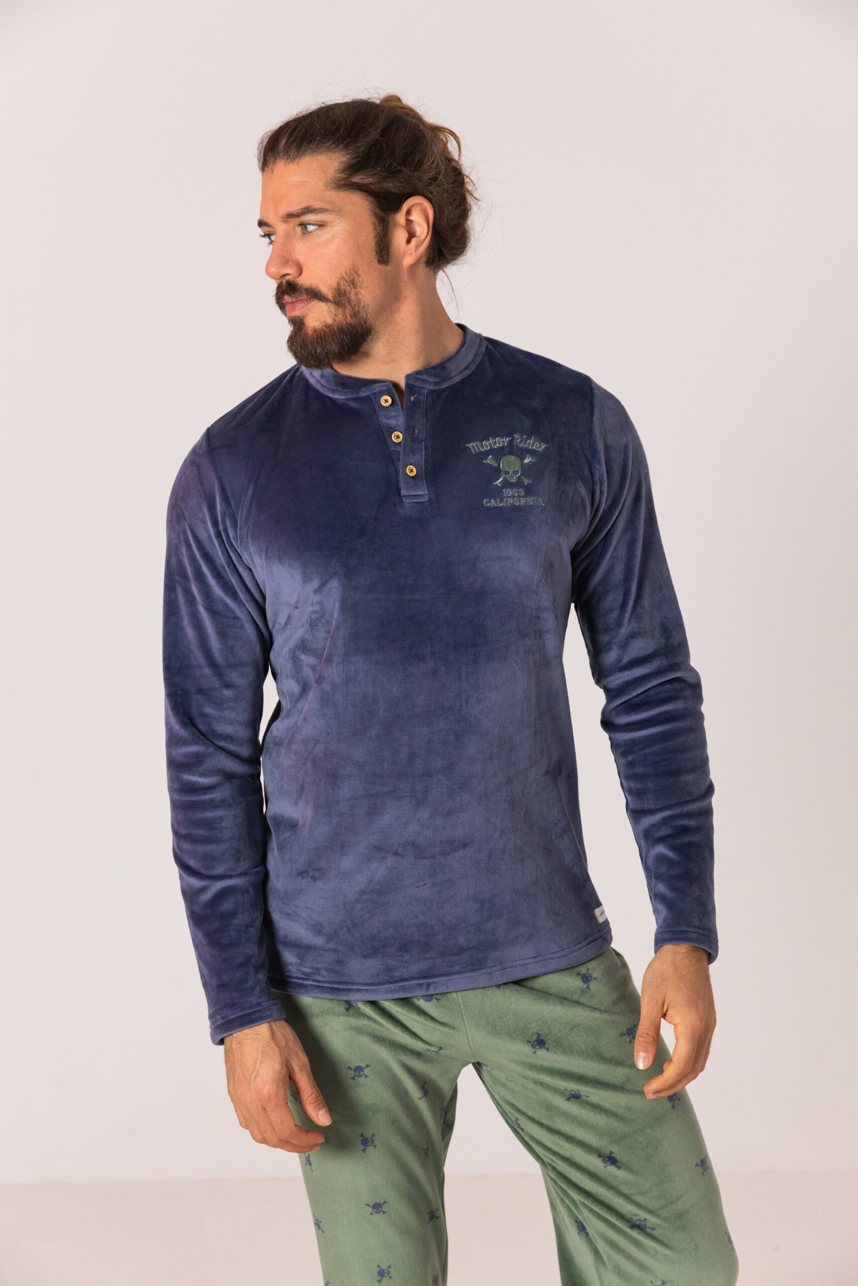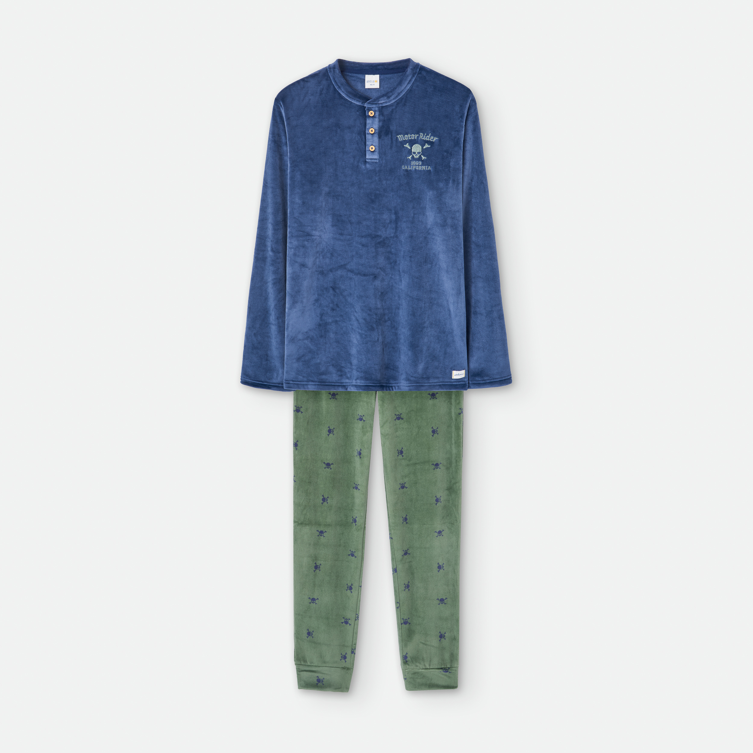 PIJAMA DOS PIEZAS DE TACTO SUAVE. CAMISETA CON FONDO AZUL MARINO, MANGA LARGA, TAPETA Y BOTONES DE MADERA. DELANTERO CON ESTAMPADO POSICIONAL DE CALAVERA.