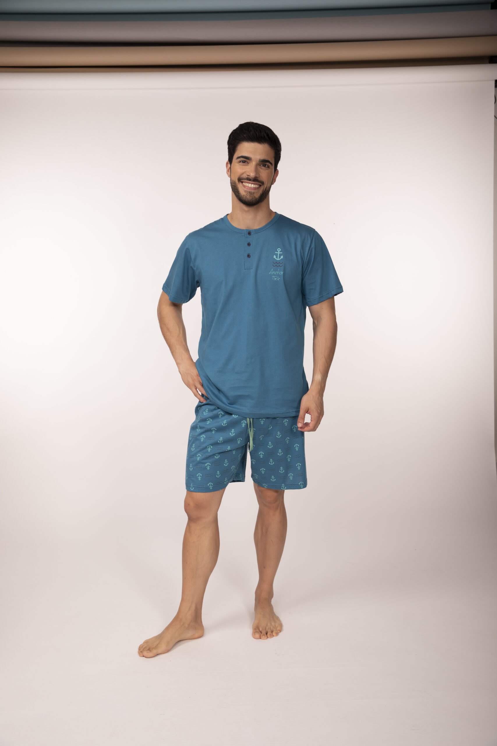 Pantalón corto. color azul con estampaciones de anclas y pequeñas ondas marinas.