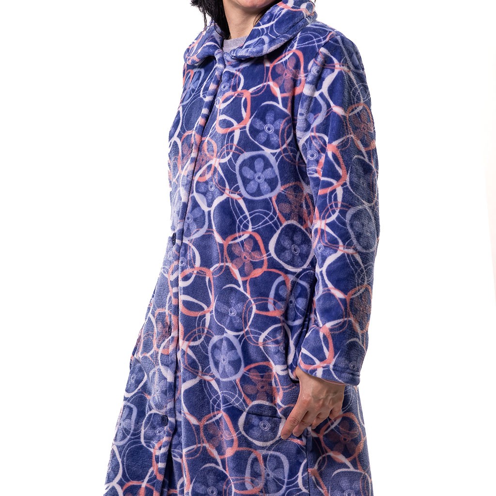 Bata para mujer de corte largo, abotonada y con bolsillos, confeccionada en suave tejido de coralina estampada.