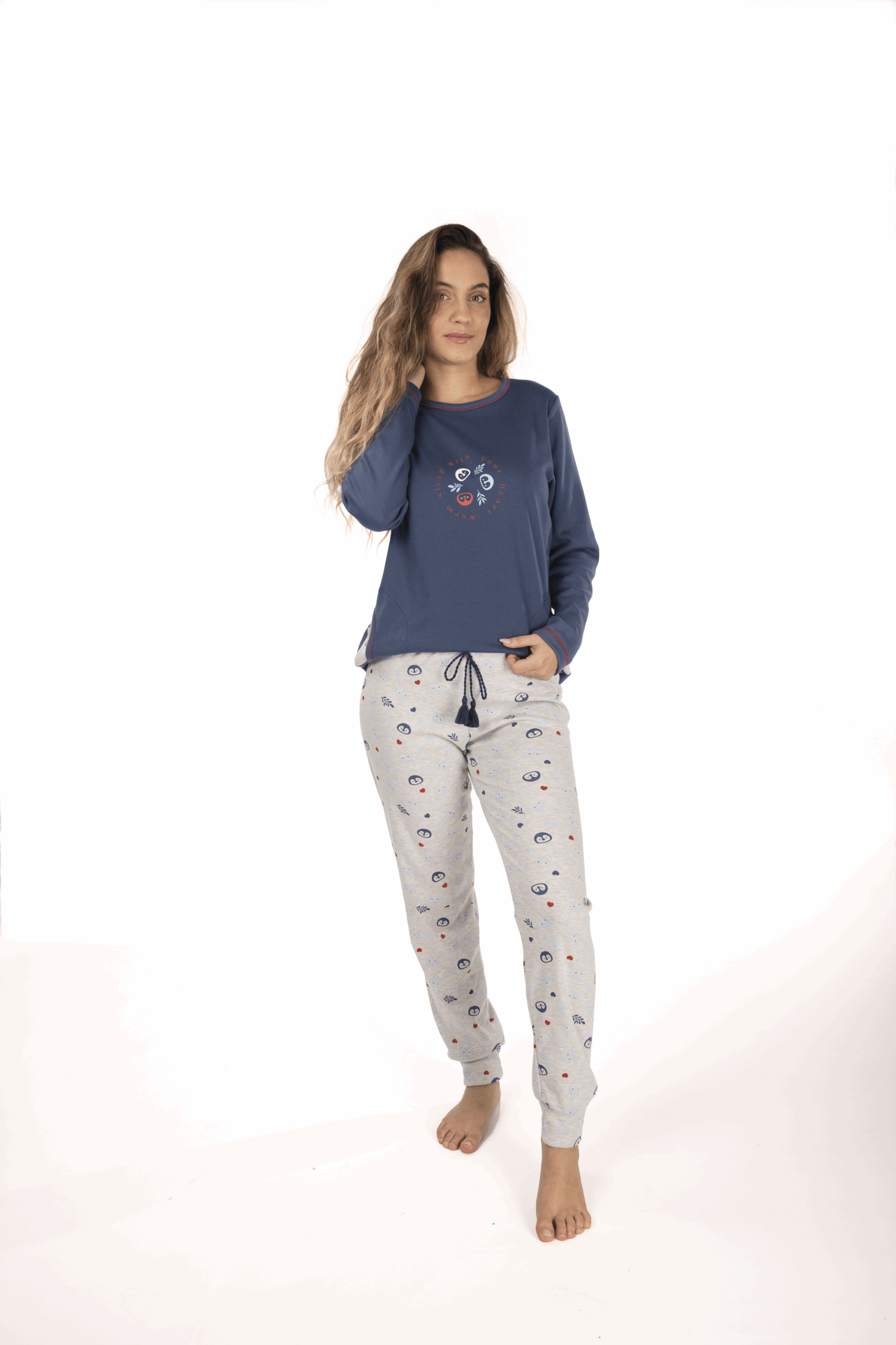 El pantalón es gris claro con estampación de las mismas caras de pingüinos de la camiseta. con puños.