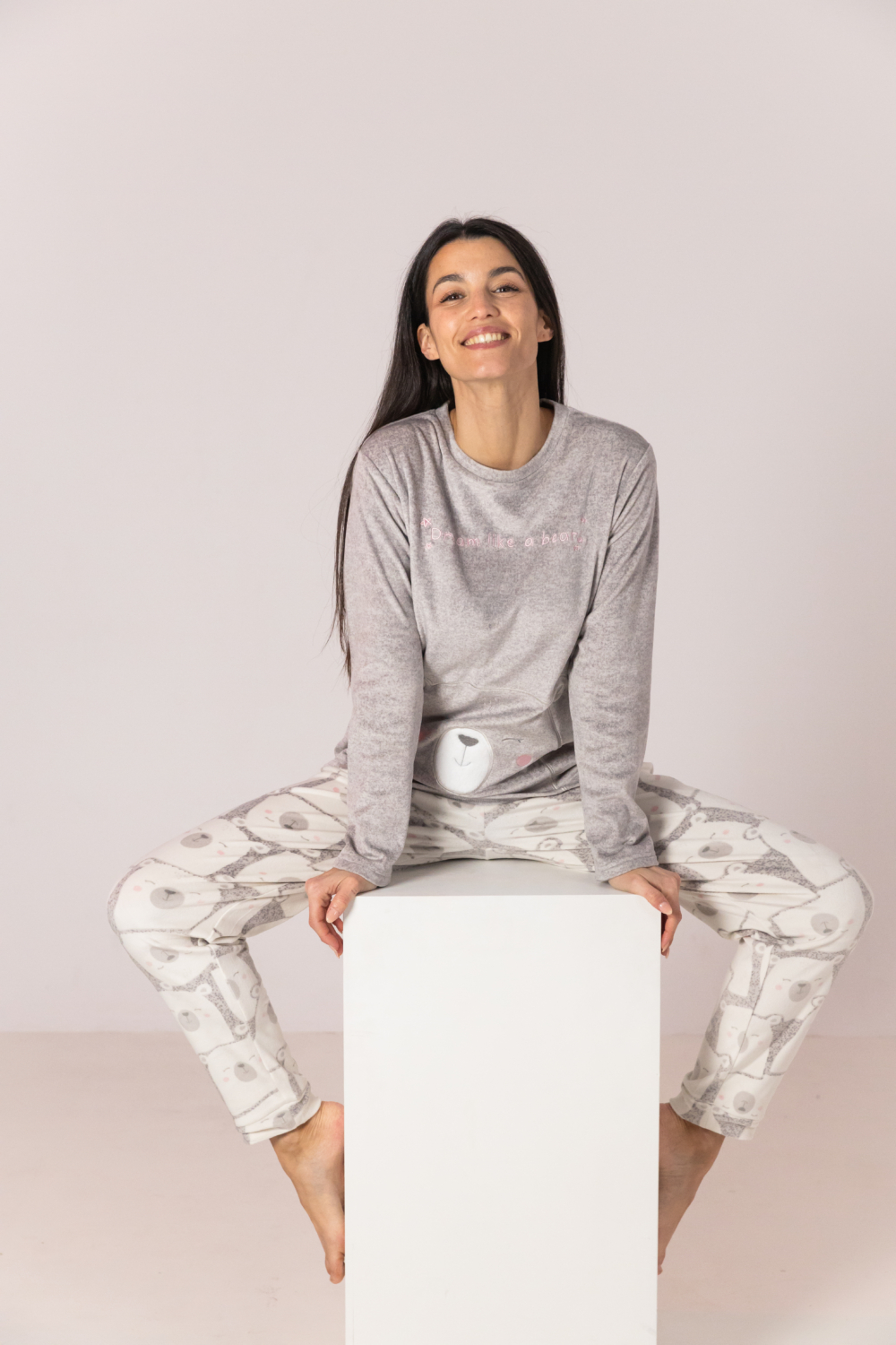 PIJAMA DOS PIEZAS DE TACTO SUAVE. CAMISETA CUELLO REDONDO Y MANGA LARGA. DELANTERO CON ESTAMPADO POSICIONAL DE UN OSO CON FONDO GRIS.